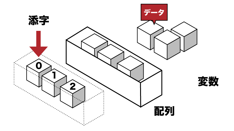 配列に格納された変数には添字が付けられ、取得したデータの一部を呼び出す時に使用します。添字は取得した順に0からの数字が自動的に振られています。