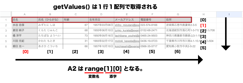 またgetValues() メソッドを使用すると各行が1つの配列で取得されます。6行7列のデータがあれば、6つの配列の中にそれぞれ7つの変数が含まれた合計42個のデータを取得します。