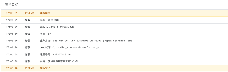 配列で取得の確認はconsole.logというメソッドを使用します。実行ログで結果が出力されます。