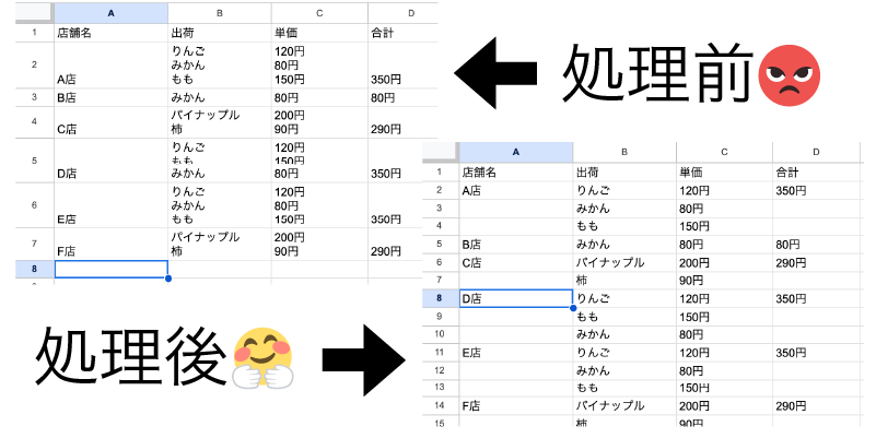 他社から送付されるエクセルデータのセル内の改行を縦方向に分割するスクリプトです。改行されているセルには料金が記述されていますが、改行が邪魔して数字と認識されず計算にできませんでした。セル内の文字を数字として計算するには改行を分割する必要があったのです。