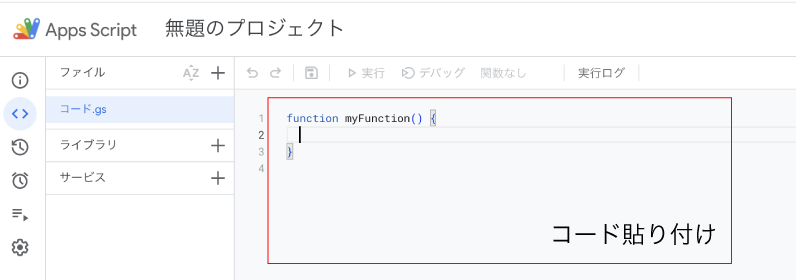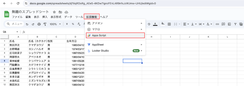 スプレッドシートを開き、拡張機能>Apps Scriptの順番で移動。するとスクリプトを作成画面が表示されます。