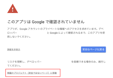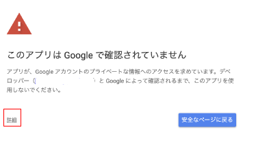 「このアプリはGoogleでは確認されていません」のページが表示されますが、「安全なページに戻る」ではなく左にある「詳細」をクリックします。