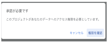 GASを始めて動かす時に「承認が必要です このプロジェクトがあなたのデータへのアクセス権限を必要としています。」と表示されます。許可しないとGASが動きませんので承認作業を進めます。権限を確認をクリックしてください。