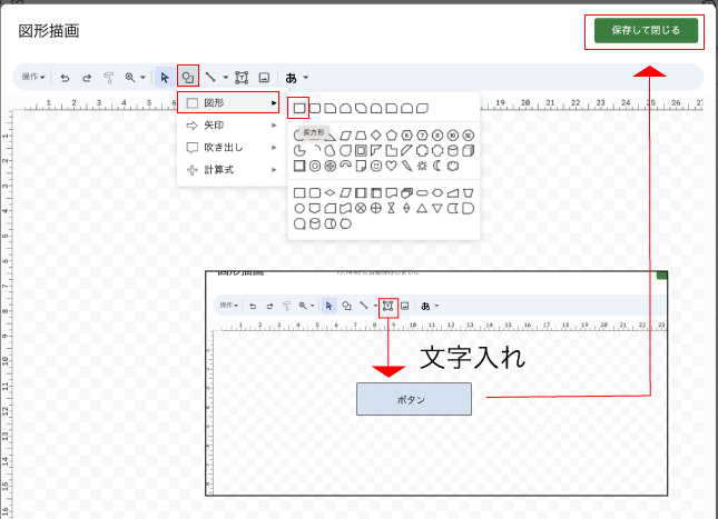 GASボタンを作成します。メニューの挿入>図形描画>をクリック。クリックすると、図形作成画面が出てきます。図形>長方形で好きな形にボタンを作成してください。テキストボックスでボタンの上に文字を表示させることができます。今回は「ボタン」の文字にしました。