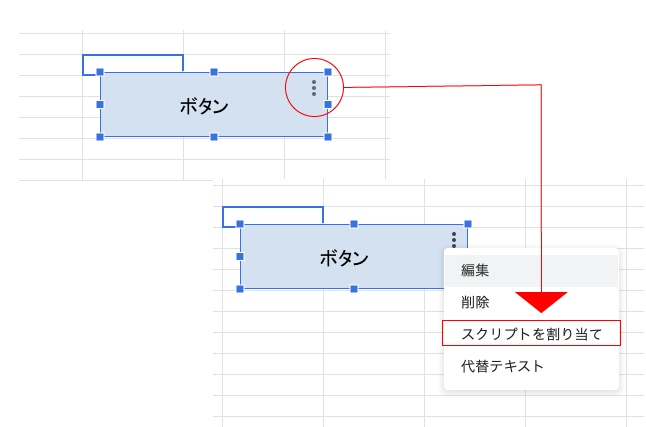 ボタンをクリックすると、右上に3つの点がでてきますのでクリックしてスクリプト割り当てを選択。入力画面には「myFunction」を入れます。これでボタンにGASが連携しました!