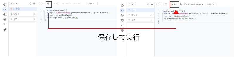 コードについて簡単に説明すると、変数spで現在使用しているシートを取得。変数rowでシートの最終行を取得。getRange(row+1,1)で、最終行の次の行のセルを選択させ画面遷移しています。